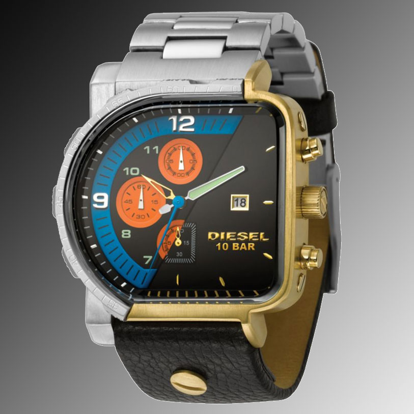 This hybrid watch is the pinnacle of Diesel design. A sleek bracelet-style watch fuses with a casual leather strap watch to create this signature Diesel timepiece. The bright, multi-colored dial features chronograph movement and a date window for added functionality.