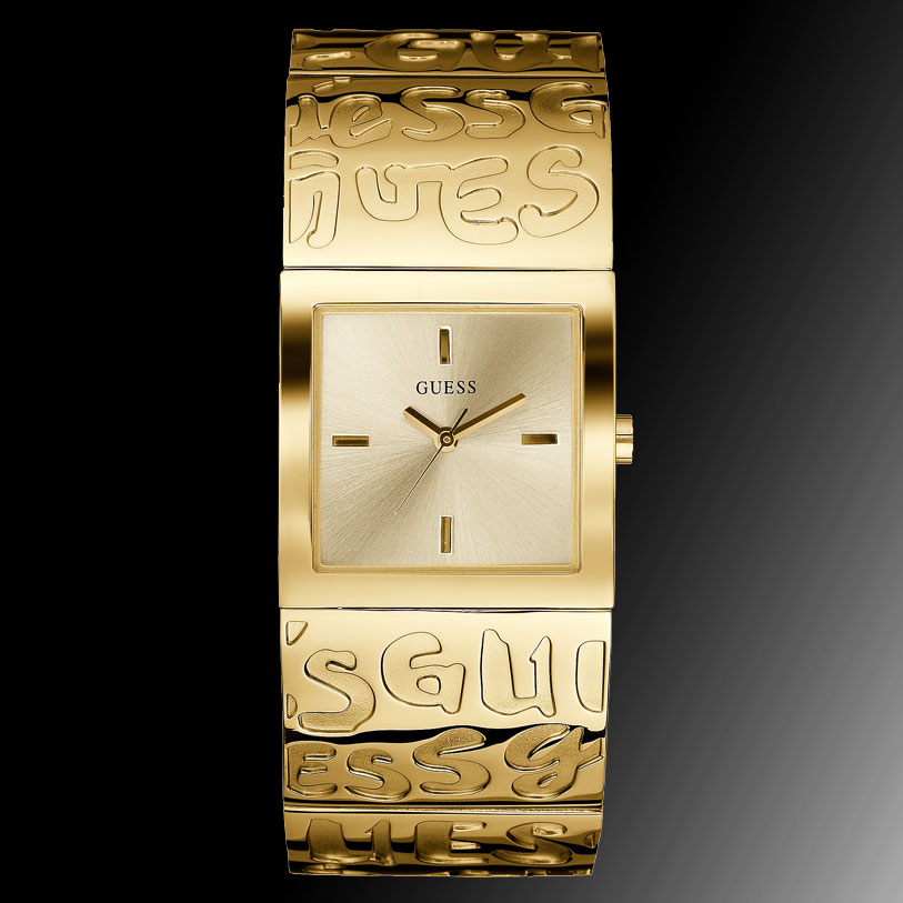 Original Tag your timepiece. This hot GUESS watch features an embossed goldtone mixed metal bangle bracelet and square case. Goldtone dial with tonal stick indices and logo. Quartz movement. Ten-year limited warranty.Comes with the original Guess Box.