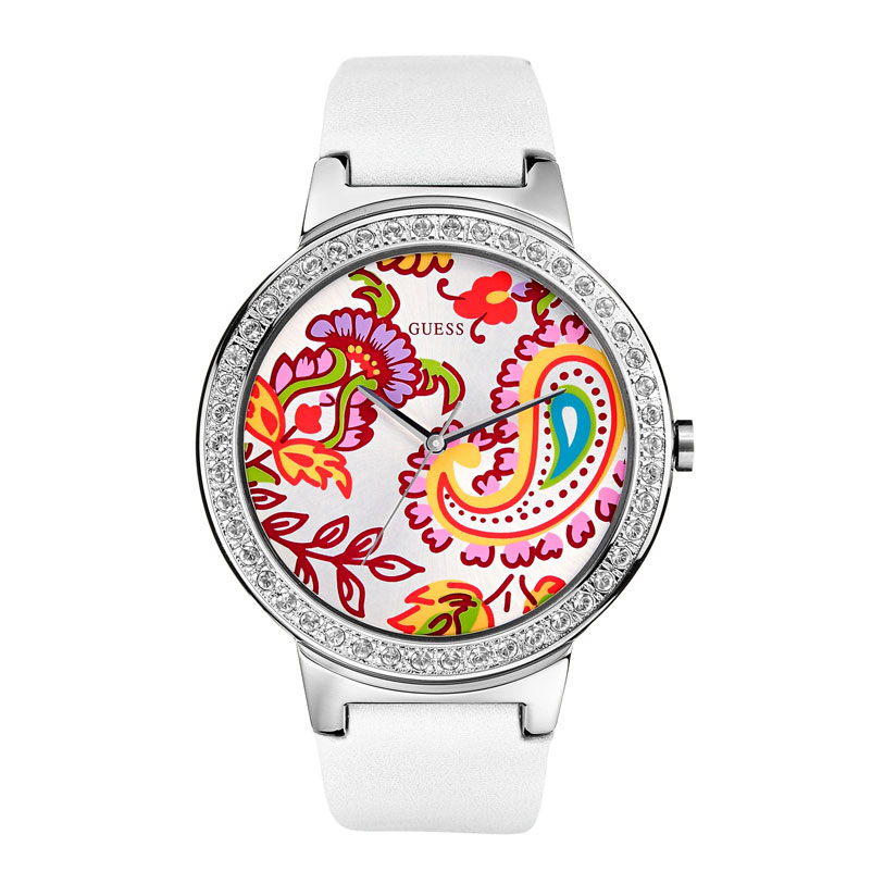 Genuine white leather strap.Paisley print dial with three hand movement.Crystal encrusted bezel, crystallized by Swarovski™.Buckle closure.Water resistant.Goes with original Guess Box.