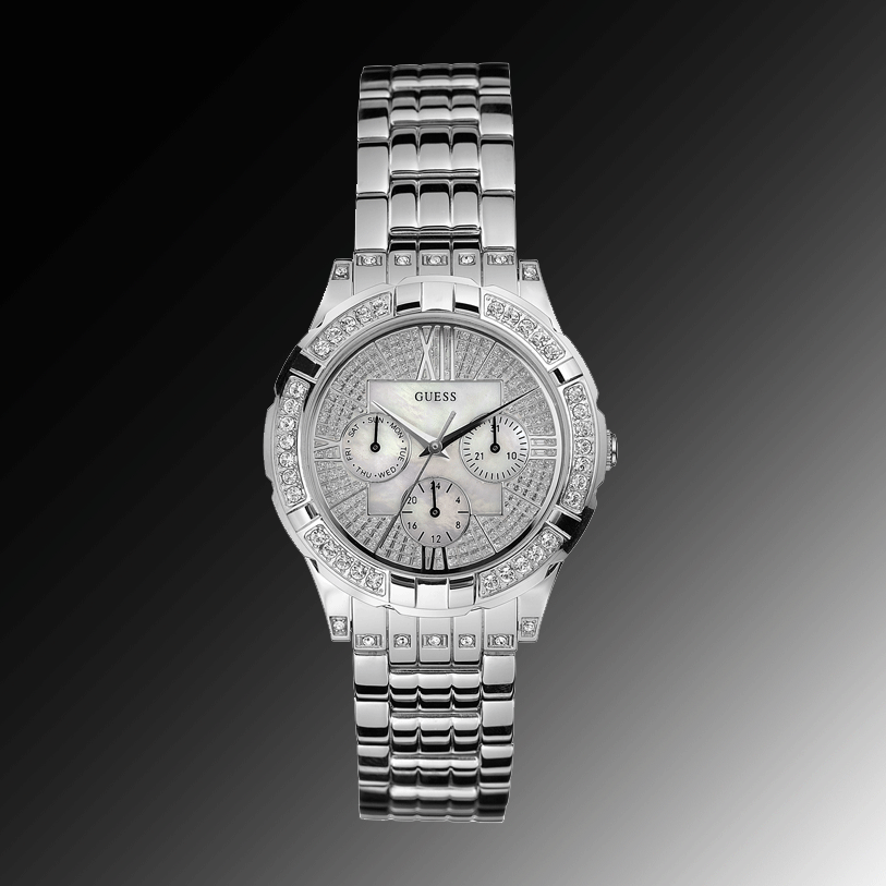 Stainless steel case and bracelet.Three-hand analog quartz movement with three sub-dials.Crystals stunningly accent the bezel.Magnificent mother-of-pearl dial.Water resistant to 100 meters/330 feet.