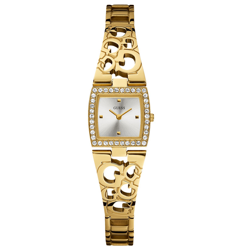 Goldtone stainless steel bracelet with cut-out logo design. Square stainless steel case with crystal-accented square bezel. Square goldtone dial with logo and crystal accent indices. Quartz movement. Water resistant to 100 meters.Goes with original Guess Box.