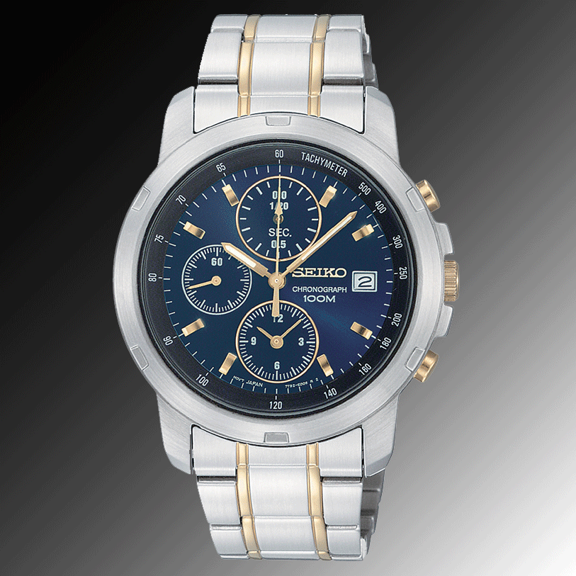 This Seiko watch features a goldtone and silvertone stainless steel bracelet and round case. Blue chronograph dial with goldtone stick indices, logo, date window and three subdials. Analog quartz movement. Water resistant to 100 meters.