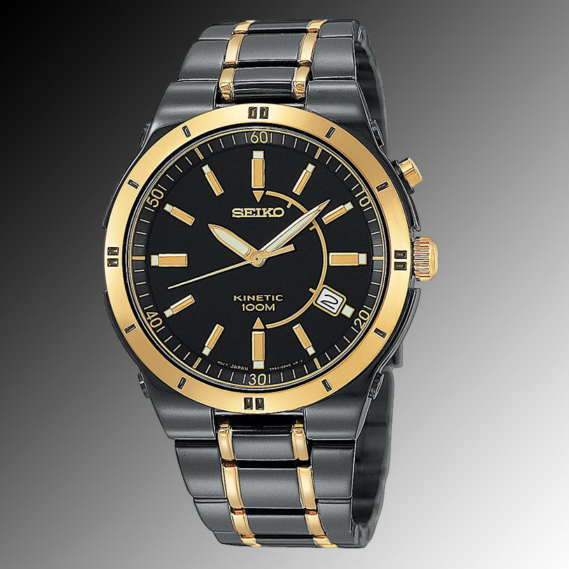 In a timely fashion: titanium carbon nitride plating on stainless steel with gleaming goldtone highlights makes for rich contrast in this Seiko watch. Automatic movement is powered by your own motions and reserve energy is stored for up to six months.Black dial with applied markers and power reserve indicator.