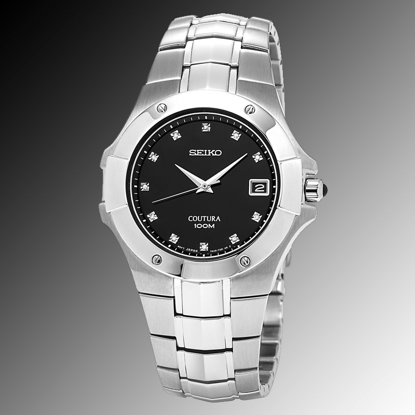 Cabochon crown and sapphire crystal. Black lacquered dial with diamond accent hour markers. Advancing date window. Link-style bracelet. Analog quartz movement. Water resistant to 100 meters.