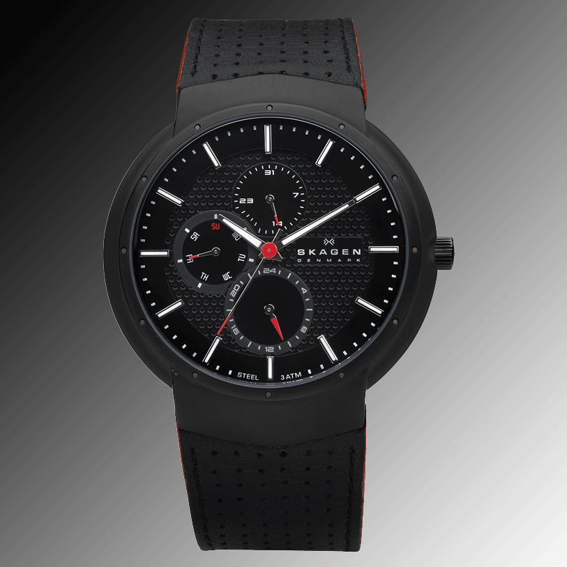 With the signature understated style of Skagen and multiple functions, this chic sports watch is a winner. Black leather strap. Black stainless steel round case and round black dial with three subdials, logo and stick indices. Quartz movement. Water resistant to 30 meters. Limited lifetime warranty.Goes with origina Skagen Box.