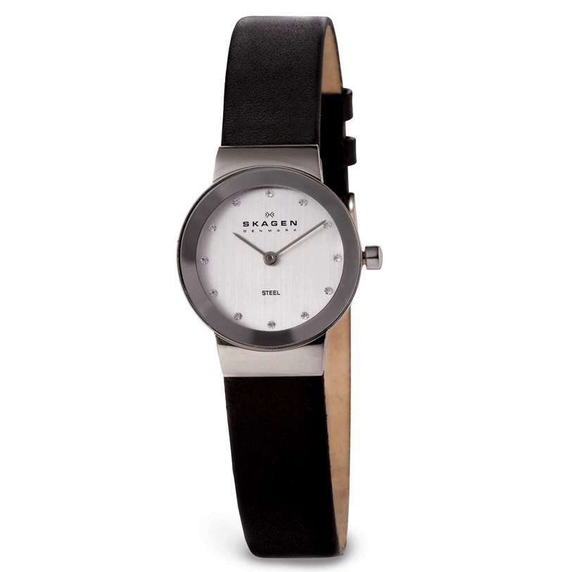 This Skagen watch features a black leather strap and round stainless steel case. Silvertone dial with Swarovski crystal markers and logo. Quartz movement. Limited lifetime warranty.Goes with original Skagen Box.