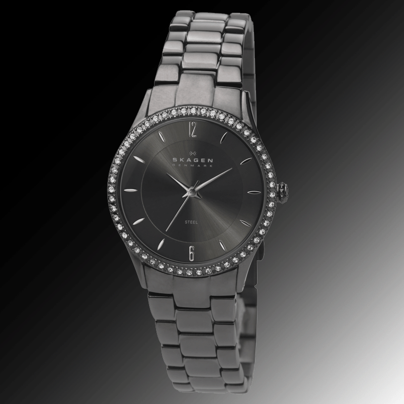Charcoal stainless steel bracelet and round case. Bezel crystallized by Swarovski elements. Charcoal dial with silvertone stick indices and logo. Quartz movement. Water resistant to 30 meters. Limited lifetime warranty. Goes with original Skagen Box