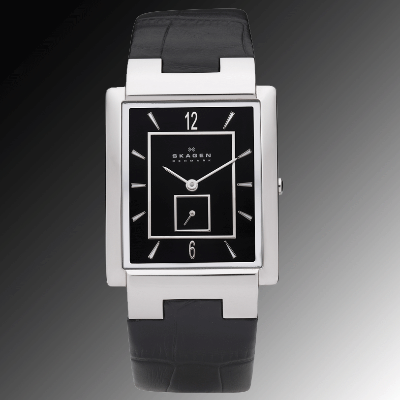 This watch features a croc-embossed black leather strap and rectangular stainless steel case. Charcoal dial with silvertone stick indices, logo and subdial. Quartz movement. Water resistant to 30 meters. Limited lifetime warranty.Goes with original Skagen Box